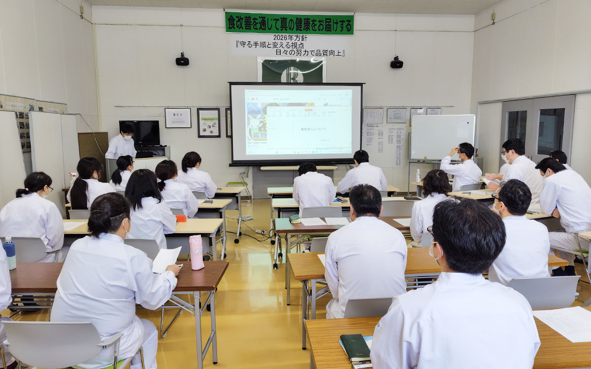 2026年1月30日に衛生委員会並びに安全防火委員会によるコーケン社員の教育訓練を実施しました。例年テーマを変えながら、衛生意識の向上や労働災害防止のための講習です。衛生管理は「食品への異物混入対策」、労働安全は「労働災害ゼロの継続に向けて」をテーマに社内研修会を実施しました。